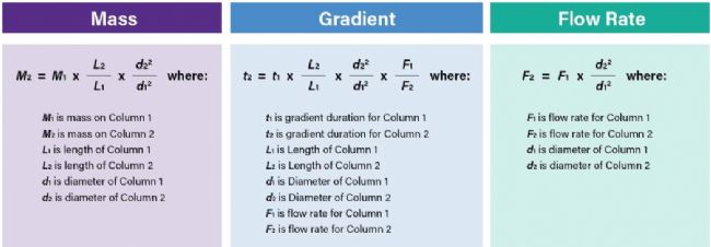 粗制肽分析完成之后的步驟是將方法幾何放大至具有相同填料的大規格色譜柱上用于分離。圖2中的放大公式展示了在不同規格色譜柱之間轉換分離方法時,色譜柱直徑、柱長、載樣量和流速之間的關系。梯度斜率表示為單位柱體積對應的溶劑變化百分比,而非單位時間內溶劑變化的百分比,可確保梯度方法從初始條件到最終條件的各個步驟輸送的柱體積數量始終相同,從而保持分離度一致。制備級方法必須包括一段用于模擬系統延遲的起始條件保持時間,具體將通過小規模分離確定,同樣以柱體積數量表示。制備型色譜分離完成后,將對收集到的餾分進行分析評估。純肽的后續處理應遵循用戶指南。