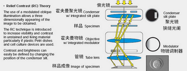霍夫曼調制相襯(Hoffman Modulation Contrast,簡稱HMC)是ROBERT HOFFMAN教授于1975年提出的一種觀察方式①,是基于斜照明技術加入偏振鏡、狹縫光闌和調制器改進而來的一種透明樣品觀察技術,特點是有三維立體感,且適用于塑料培養皿,有人稱之為“窮人的DIC”,主要用于IVF注射等顯微操作。