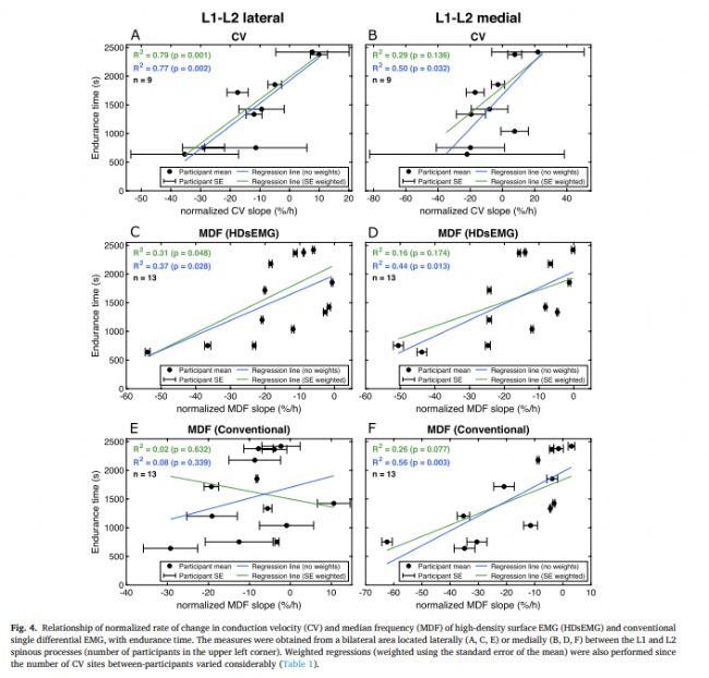 與CV相比,使用頻譜參數評估軀干伸肌耐力相關性較低。高密度表面肌電圖(HDsEMG)和單通道EMG兩者的頻譜參數的線性變化率與耐力時間之間的相關性均較低或無顯著相關性。