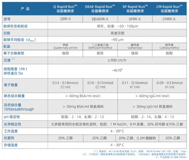 ABT 提供兩種陽離子交換劑:SP Rapid Run™ 瓊脂糖微球:使用磺丙基活化的高度交聯微球。CM Rapid Run™ 瓊脂糖微球:使羧甲基活化的高度交聯微球。