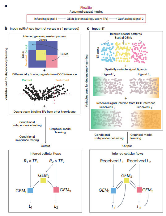文章摘要:從單細胞 RNA 測序(scRNA-seq)和空間轉錄組學(ST)中,我們可以提取出高維基因表達模式,這些模式可以用細胞間通信網絡或解耦基因模塊來描述。這兩種信息流描述通常被認為是獨立發生的。然而,細胞間通信會驅動由細胞內基因模塊介導的定向信息流,進而觸發其他信號的流出。目前還缺乏描述這種細胞間信息流的方法。我們介紹的 FlowSig 是一種利用圖形因果建模和條件獨立性從 scRNA-seq 或 ST 數據中推斷通訊驅動的細胞間信息流的方法。我們使用新生成的皮質類器官實驗數據和數學建模生成的合成數據對 FlowSig 進行了基準測試。我們通過將 FlowSig 應用于各種研究來證明它的實用性,結果表明 FlowSig 可以捕捉刺激誘導的胰島旁分泌信號的變化,證明 COVID-19 嚴重程度增加導致的細胞間流的變化,以及重建小鼠胚胎發生中形態發生驅動的激活劑-抑制劑模式。