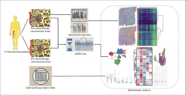 文章摘要:骨肉瘤是一個錯綜復雜的細胞生態系統,其中異型相互作用對疾病進展和治療效果有著重要影響。盡管骨肉瘤非常重要,但人們對其細胞組成和組織結構的詳細了解卻仍是空白。在本研究中,我們對人類骨肉瘤進行了全面的單細胞和空間轉錄組學分析。我們構建了細胞元圖譜來剖析空間轉錄組數據,揭示了骨肉瘤組成亞群的詳細圖譜。我們細致地描述了每個亞群的獨特基因特征和功能狀態,并研究了化療對這些細胞亞群的影響。此外,我們的空間轉錄組學分析還發現了一個獨特的空間生態位,它位于腫瘤壞死區的最前沿,可能與化療耐藥性有關。還深入研究了不同細胞亞群之間的相互影響。這項研究為骨肉瘤的細胞結構提供了一個全面的轉錄圖譜,豐富了對其復雜性的理解,并為更有針對性的治療方法奠定了基礎。