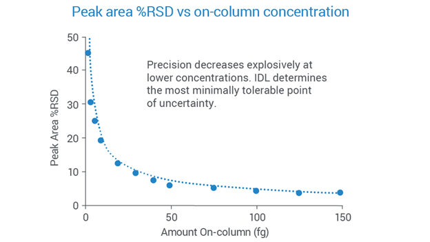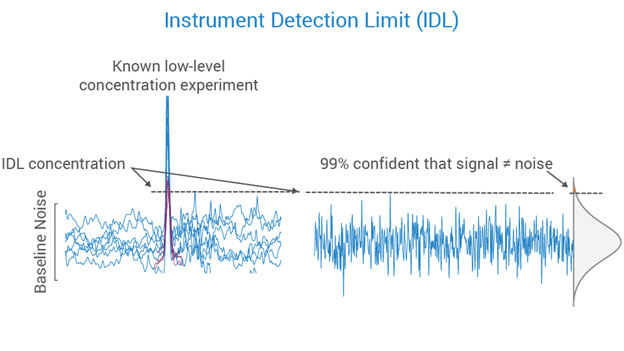 儀器檢測限 (IDL) 是分析靈敏度的統計測量方法,考慮了測量的精密度。它表征了要使測量信號為真實信號(而不是基線噪音)為 99% 可信度所需的分析物量(樣品濃度或柱上量)。