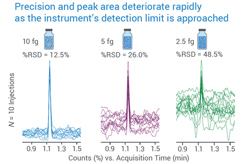 IDL 是使用樣品的重復測量來確定的;確保分析物在一系列進樣中能夠得到可靠檢測。在儀器基線附近測量測試樣品的響應,從而提供可靠、統計合理的儀器在低水平下的性能特征。