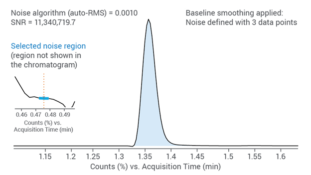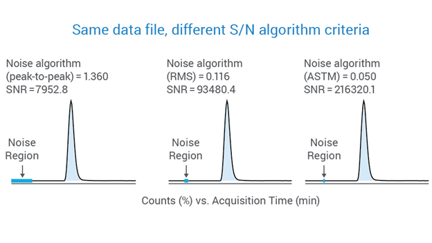 S/N 可以使用可以夸大指標的算法來計算。每種算法略有不同,即使樣本相同,也會生成不同的結果。許多算法也被設置為在較短的時間窗口內搜索噪聲盡可能低的區域,并應用人工平滑,從而使指標產生偏差。此外,信噪比由單次進樣確定,表示采樣 n=1。