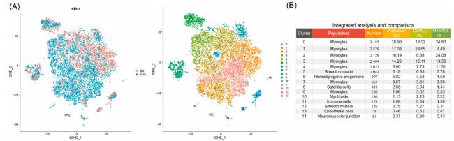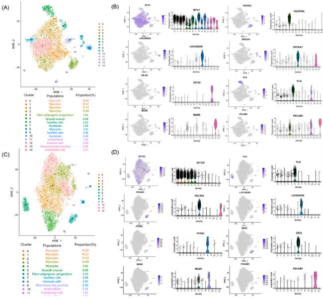 為了獲得牛骨骼肌發(fā)育的細(xì)胞群體圖譜并表征細(xì)胞異質(zhì)性,我們對(duì)從出生后(D8)和成年(M18)牛骨骼肌組織獲得的單核細(xì)胞懸液進(jìn)行了基于液滴的單核RNA測序(snRNA-seq)。在過濾掉7720個(gè)捕獲自D8的細(xì)胞后,剩余的7638個(gè)細(xì)胞根據(jù)相似的基因表達(dá)模式被歸類為15個(gè)細(xì)胞簇。這些15個(gè)簇包含16至1520個(gè)細(xì)胞,占分析細(xì)胞總數(shù)的0.21%至19.9%,其中簇0是最大的亞群,簇14是最小的亞群。同時(shí),M18形成了13個(gè)分離的簇,包含26至2019個(gè)細(xì)胞,占分析細(xì)胞總數(shù)的0.28%至21.91%。基于先前確定的標(biāo)記物的表達(dá),并使用t分布隨機(jī)鄰域嵌入(t-SNE)可視化數(shù)據(jù)確定了細(xì)胞種類,。通過此分析,我們確定了骨骼肌中的所有主要細(xì)胞類型,包括肌細(xì)胞、平滑肌、成纖維/脂肪生成祖細(xì)胞(FAPs)、衛(wèi)星細(xì)胞(SCs)、成肌細(xì)胞、免疫細(xì)胞和內(nèi)皮細(xì)胞,以及肌細(xì)胞的一個(gè)罕見功能特化區(qū)域——神經(jīng)肌肉接頭(NMJ)。通過表達(dá)規(guī)范標(biāo)記基因,包括PDGFRA、DCN(FAPs)、PLN(平滑肌)、CD163和PTPRC(免疫細(xì)胞)識(shí)別非肌核簇。肌核群體的基因表達(dá)包括MYH1、CKM(肌細(xì)胞)、Pax3、Pax7(LOC532669)(SCs)、MyoD1、MYF5、SPOCK1(成肌細(xì)胞)。NMJ核為已知規(guī)范標(biāo)記MUSK陽性。