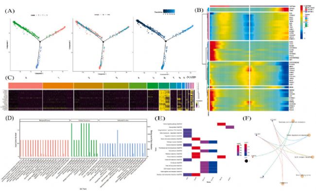 使用Monocle算法進(jìn)行的軌跡推斷分析揭示了FAPs、平滑肌和SCs之間的關(guān)系。根據(jù)偽時(shí)間分析的結(jié)果,簇6中的FAPs被確定為初始狀態(tài)。在骨骼肌發(fā)育過程中,簇6中的一部分FAPs轉(zhuǎn)變?yōu)榇?中的平滑肌細(xì)胞,而一小部分轉(zhuǎn)變?yōu)榇?中的SCs。研究將前50個(gè)差異基因被分為六類,展示了決定預(yù)分支細(xì)胞向細(xì)胞命運(yùn)1和細(xì)胞命運(yùn)2狀態(tài)分化的基因,顯示了每個(gè)細(xì)胞狀態(tài)中高度可變基因的趨勢,并指出了三個(gè)細(xì)胞亞群之間的分化關(guān)系。