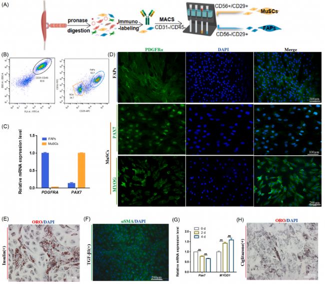 基于表面標(biāo)記物PDGFRα、CD56、CD29等的表達(dá),通過磁激活細(xì)胞分選(MACS)從延邊牛骨骼肌中分離出FAPs和MuSCs。RT-qPCR結(jié)果顯示,與MuSCs相比,F(xiàn)APs中PDGFRα的表達(dá)顯著增加,而Pax7的表達(dá)顯著下降。同樣,免疫熒光染色也觀察到FAPs中PDGFRα蛋白特異性表達(dá),MuSCs中檢測到Pax7和MyoG的表達(dá)。
