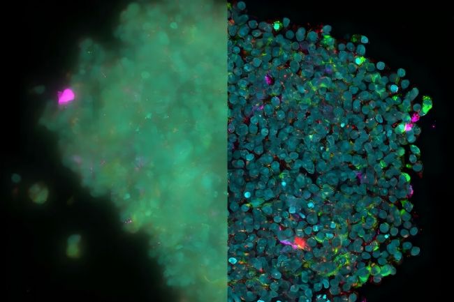 對離體人類胰島進行 EDoF 重建,以實驗檢測單個人類胰島細胞中促炎細胞因子 IL-17 的表達。圖像具有以下標記:胰島素(AF488;綠色)、胰高血糖素(AF555;紅色)和 IL-17(AF647;品紅色)以及 Hoechst(細胞核;藍色)。圖片由美國加利福尼亞州拉霍亞免疫學研究所 Matthias Von Herrath 實驗室提供