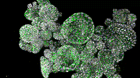 類器官集群,細胞核用 DAPI 染色,細胞質膜用 GFP 染色。圖片由奧地利維也納醫科大學癌癥研究所 Dana Krauß 提供。