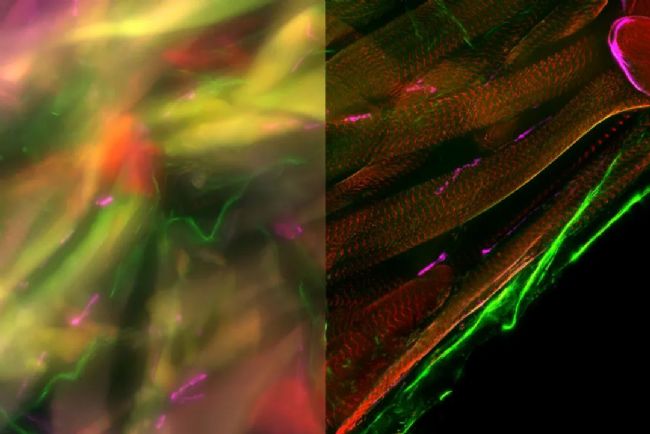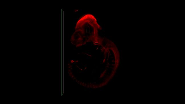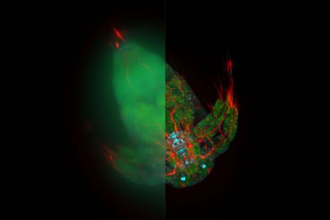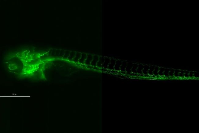 斑馬魚幼體(受精后 72 小時)。血管用綠色(熒光)表示。樣本由德國巴特諾海姆馬克斯-普朗克心肺研究所的 Almary Guerra 博士和 Didier Stainier 博士提供。