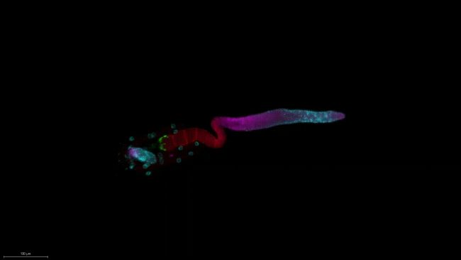 成年雌雄同體,染色:藍色 - DAPI(細胞核),綠色 - SP56(精子),紅色 - RME-2(卵母細胞),紅斑 - PGL-1(RNA + 蛋白顆粒)。圖片由德國哈勒馬丁路德大學 Christian Eckmann 博士教授提供