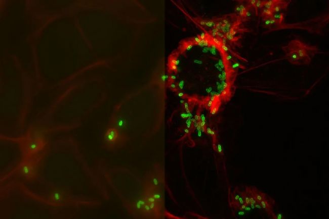 感染鼠傷寒沙門氏菌的 MDCK 上皮細胞顯示細菌誘導的廣泛肌動蛋白重排(紅色)(綠色,纖毛中的 GFAP 蛋白)。物鏡:HC PL APO 40x/0.95 DRY。圖片由英國布里斯托爾大學 Mark Jepson 博士提供。