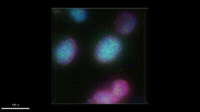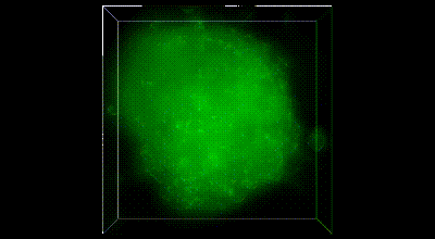 用 Alexa Fluor 568 磷脂酰蛋白(肌動蛋白)和 YOYO 1 碘化物(細胞核)染色的 HeLa 細胞球。