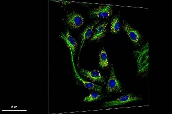 培養的皮層神經元,其中綠色表示 beta-III-tubulin,藍色表示細胞核。由 59 個平面組成的圖像堆棧體積為 21 µm³。樣本由德國馬格德堡 FAN GmbH 提供。
