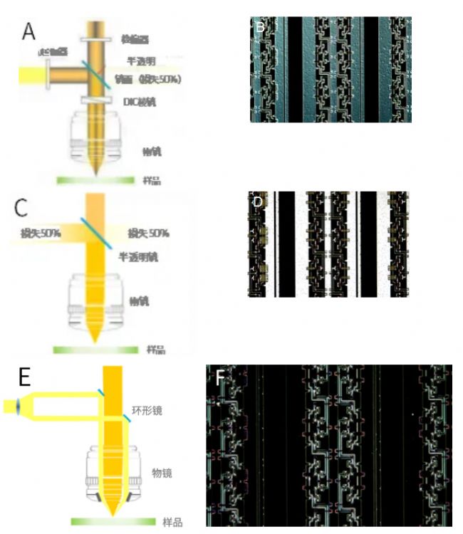 圖1:用 DIC、明場和暗場照明成像的圖案化晶圓樣品圖像:A) 顯微鏡光學(xué)中的入射光路徑用于 DIC 和B) 樣品圖像;C) 明場的入射光路徑和D) 樣品圖像;以及E) 暗場的入射光路徑和F) 樣品圖像。