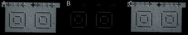圖2:使用 DIC 拍攝的圖案化晶圓區(qū)域的圖像,具有:A) 負(fù)偏差,B) 無偏差,和 C) 正偏差。加號和正方形形狀的邊框在負(fù)偏差時看起來像是從表面升起,在正偏差時則 像是陷入表面。