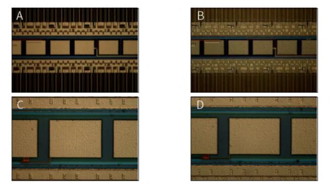 圖4:使用 DM6 M 顯微鏡,采用具有負(fù)偏移(A和C)和正偏移(B和D)的光波剪切的差分干涉對比(DIC)技術(shù),對圖 案化晶圓的不同區(qū)域進(jìn)行成像。
