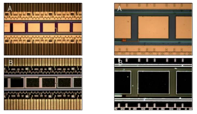 圖5: 圖4中顯示的圖案化晶圓的相同區(qū)域,但這次是使用DM6 M顯微鏡在A)明場和B)暗場照明下成像。