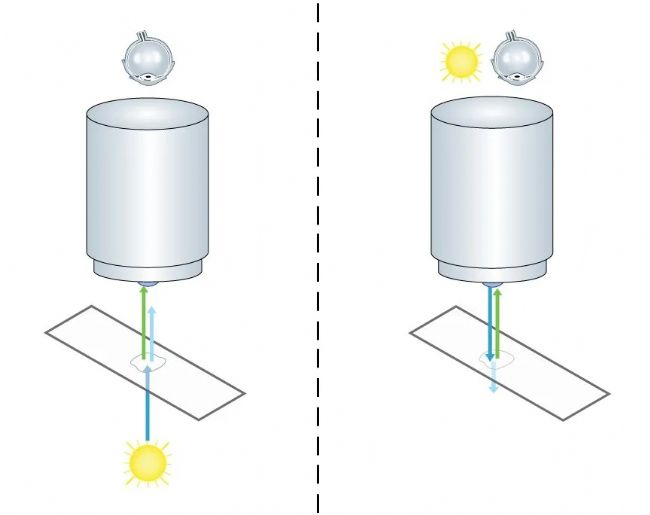 圖 1:外延照明在熒光顯微鏡中的優勢:在透射照明的情況下(左圖),光源和圖像檢測位于物鏡的兩側。在這種設置下,一個明顯的限制就是無法檢測到激發光(淺藍色)。相比之下,Epi-Illumination(右圖)使用物鏡進行照明和圖像檢測。對于熒光顯微鏡來說,這意味著用戶不會受到激發光的照射。