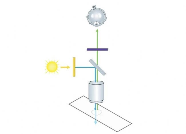 圖 3:熒光外延照明需要一個二向色鏡(灰色),它能夠將激發光(藍色)反射到試樣上,并將發射光(綠色)傳遞到檢測端。激發光的波長可通過相應的濾光片(橙色)進行預選。朝向檢測側的濾光片(紫色)只允許熒光團的波長通過,并排除激發光的殘余雜散光。