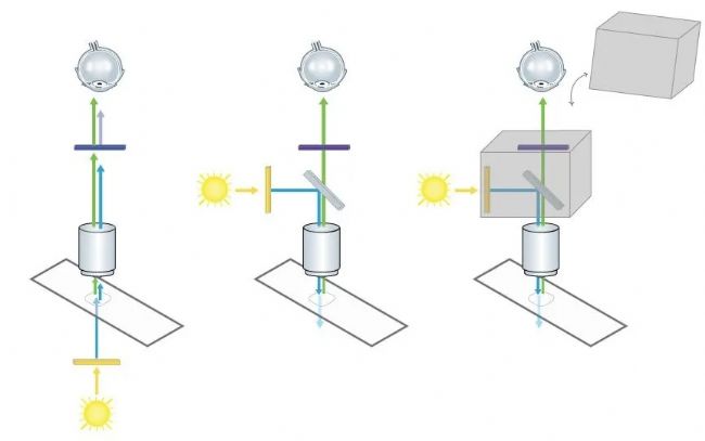 在研究活動中,他發現熒光顯微鏡是一種強大的工具。20 世紀 60 年代,一種特殊的標本照明方式開始流行,事實上,早在 1925 年,對絲蟲自發熒光事件感興趣的 Policard 和 Paillot 就已經知道并描述了這種照明方式(Policard 和 Paillot,1925 年)。一些研究人員重新啟動了這兩位法國科學家的項目,將熒光照明和樣品檢測放在顯微鏡的同一側。這種利用入射光的原理被稱為 "Epi-Illumination",與透射顯微鏡形成鮮明對比。在熒光顯微鏡中使用這種技術的一大好處是可以避免檢測光源發出的發射光(圖 1)。另一個優點是機械性更強:在透射照明中,聚光器和物鏡有兩個獨立的光軸,必須仔細對準。而在外延照明中,物鏡既是聚光器,又是集光物鏡。這樣就可以避免對準問題。