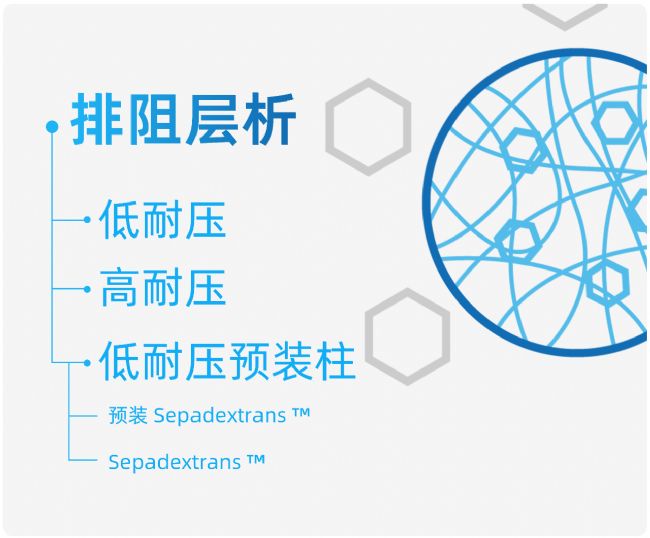 Sepadextran™ -50 可用于核酸與蛋白的純化工作,排阻極限為 25 kDa 的蛋白或20個堿基對的核酸。