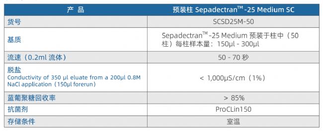 預裝柱 Sepadextran™ -25 Medium SC 是水合凝膠過濾柱,用于快速而高效地將蛋白、酶或者抗體樣品中的小分子(如:鹽、染色劑、氨等)移除。這種裝有Sepadextran™ -25 Medium 的柱子也可用于 5kDa 排阻層析的蛋白或核酸純化。
