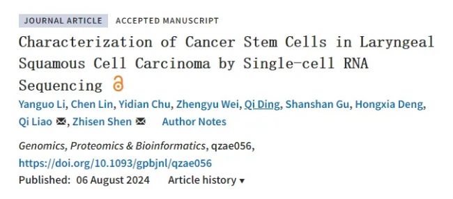 Li Y, Lin C, Chu Y, Wei Z, Ding Q, Gu S, Deng H, Liao Q, Shen Z. Characterization of Cancer Stem Cells in Laryngeal Squamous Cell Carcinoma by Single-cell RNA Sequencing. Genomics Proteomics Bioinformatics. 2024 Aug. doi: 10.1093/gpbjnl/qzae056.
