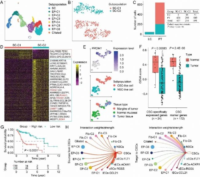 然而,腫瘤組織中可能同時(shí)存在腫瘤干細(xì)胞和正常干細(xì)胞(NSCs),進(jìn)一步聚類分析獲得SC-C1和SC-C2兩個(gè)群體(圖1B)。研究團(tuán)隊(duì)發(fā)現(xiàn)94.12%來(lái)源于腫瘤組織的SCs被歸類為SC-C2,相反67.81%來(lái)源于癌旁組織的干細(xì)胞被歸類為SC-C1(圖1B)。與SC-C1相比,SC-C2表現(xiàn)出Wnt/β-catenin信號(hào)通路、Notch信號(hào)通路、低氧、MYC靶點(diǎn)、炎癥和干擾素反應(yīng)通路的高活性。轉(zhuǎn)錄因子活性分析顯示,SC-C2中RUNX1(13g)和SOX4(20g)調(diào)控子的AUC評(píng)分顯著高于SC-C1;與先前研究一致,RUNX1和SOX4通常與癌癥復(fù)發(fā)、癌細(xì)胞干性的維持有關(guān)。SC-C2高表達(dá)FOLR1、CCL28、FRZB等標(biāo)志基因,免疫組化也顯示PROM1和FOLR1在癌旁組織中的表達(dá)水平高于腫瘤組織。綜上,研究團(tuán)隊(duì)確認(rèn)SC-C2具有明顯的腫瘤干細(xì)胞特征,并且在癌旁組織中富集。進(jìn)一步使用其他LSCC單細(xì)胞測(cè)序數(shù)據(jù)和TCGA數(shù)據(jù)也驗(yàn)證了CSCs的真實(shí)存在和組織定位(圖E-F)。