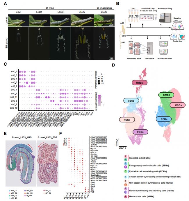 本研究通過snRNA-seq和ST技術,系統地描繪了家蠶在幼蟲末期絲腺細胞的時空分布和功能動態變化。研究揭示了絲腺細胞類型及其在絲蛋白合成中的角色,闡明了細胞狀態轉變、調控網絡和細胞間通訊在高效絲蛋白合成中的作用,并強調了蛻皮激素受體(尤其是超螺旋蛋白)在絲腺內復制中的不可或缺作用。這些發現為理解蠶絲腺的分子機制提供了重要參考,并為開發可持續的天然絲蛋白產品提供了新的視角。