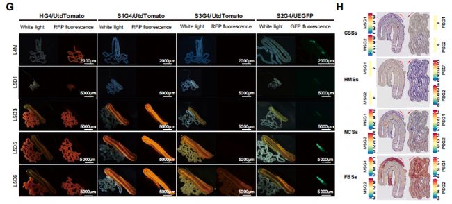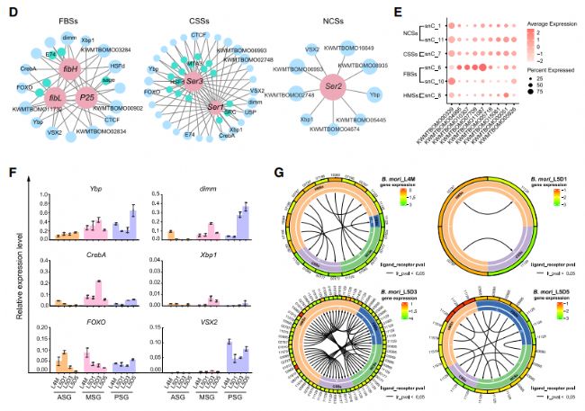 在FBSs、CSSs和NCSs中,特定TFs(如Dimm、FOXO、VSX2、CrebA和Xbp1)對絲蛋白基因具有顯著的調控作用。通過CelIPhoneDB分析發現,細胞間通訊在L5D3階段的MSG/PSG細胞中最為頻繁,特別是HMSs與其他細胞類型之間的通訊,表明細胞間通訊在絲蛋白大規模合成過程中起到重要作用。