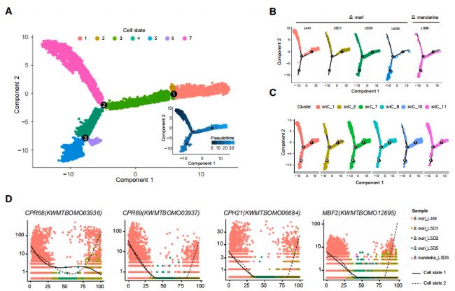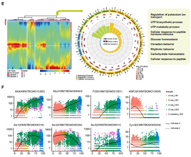 通過偽時間軌跡分析發現,絲腺細胞在幼蟲末期經歷了三個分支和七個細胞狀態。在L4M和L5D1階段,細胞狀態以1、2和7為主,而在L5D3階段,細胞狀態3和4顯著增加,表明這是絲蛋白高效合成的重要轉折點。在L5D3階段,絲蛋白基因(如fibH, fibL, P25, Ser1, 和 Ser3)的表達顯著增加,而Ser2和MBF2的表達下降,表明絲蛋白合成從抑制狀態轉變為活躍狀態。