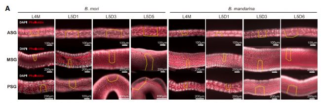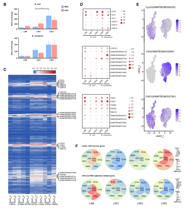 研究發現,絲腺細胞在幼蟲末期通過內復制過程獲得高度分支的細胞核,這是合成絲蛋白所必需的。CDK抑制劑(CKI)基因在絲腺細胞中高度表達,表明細胞生長受到抑制。特別是CycG和CycT這兩個細胞周期蛋白在MSG/PSG細胞類型中普遍表達,可能作為絲腺內復制周期的核心調控因子。