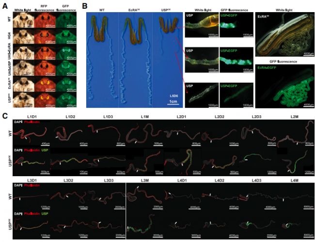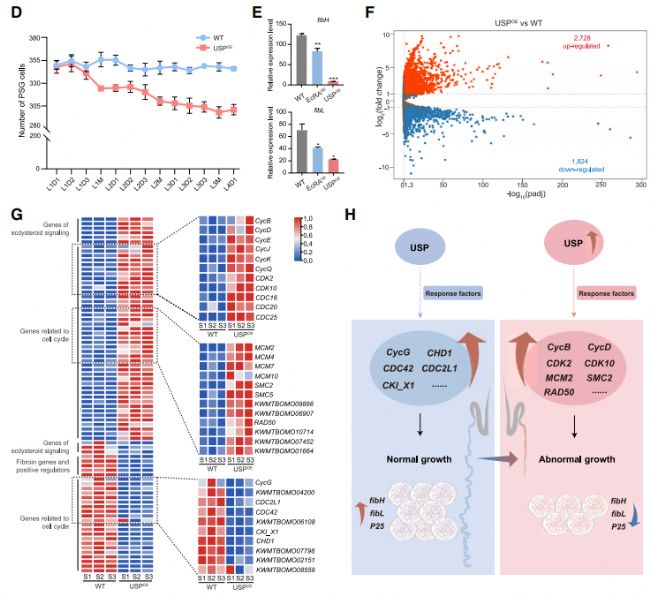 研究發現,蛻皮激素受體(EcR)和超螺旋蛋白(USP)在幾乎所有絲腺細胞類型中普遍且相對高度表達。通過轉基因過表達實驗,發現USP的過表達導致絲腺細胞數量顯著減少和絲腺退化,特別是幼蟲末期。過表達USP的PSG中,許多細胞周期相關基因顯著上調或下調,表明USP在絲腺發育和內復制過程中起到關鍵的調控作用。