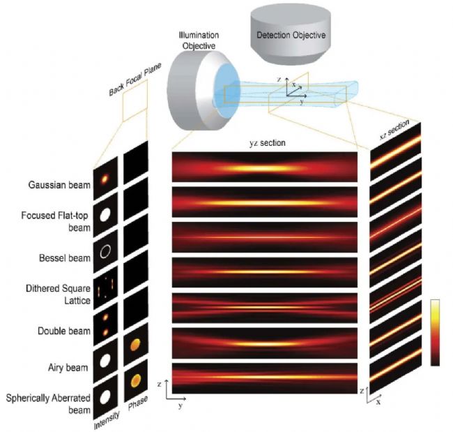 圖 1 顯示了比較中包含的六種光片類型的示意圖。利用照明物鏡后焦平面電場的幅度和相位來模擬樣品體積中光束的強度分布。展示了光束掃描或光片抖動產生的光片在照明和檢測軸(YZ)以及掃描軸和檢測軸(XZ)上的截面。