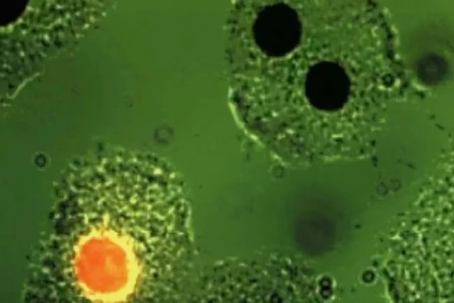 圖 8: "蓮座狀 "的人類血細胞。用紫外光落射照射用藍色熒光染料石炭酸染色的紅細胞。曙紅染色的淋巴細胞經綠光激發后用發射出橘紅色的熒光[19]。