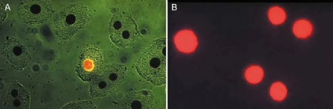 圖 7:用抗 kappa TRITC 結合物和抗 IgG FITC 結合物對骨髓細胞進行染色。用窄波段綠光和藍光外顯,含有 TRITC 的細胞發出紅色熒光,含有 FITC 的細胞發出綠色熒光。有些細胞同時含有 FITC 和 TRITC。