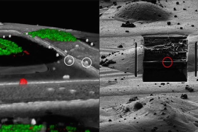 圖9:在LM和FIB圖像中關聯標記。左圖:點擊觀察結構周圍的液滴,并在3D圖像中執行質心定義(白圈中的綠點)計算得到的位置隨后投影到FIB圖像(右圖)上根據液滴標記,計算目標結構的位置并標記到FIB圖像中(紅圈中的紅點)。離子束圖像由德國海德堡歐洲分子生物學實驗室(EMBL)Mahamid Group的Herman K. H. Fung友情提供。比例尺:20微米。