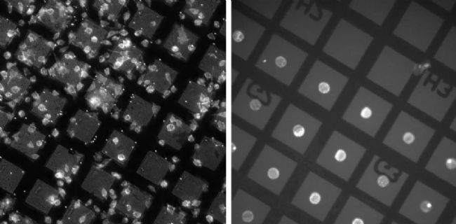 圖2:有/無微型圖案的細胞分布情況左圖:分布不均的細胞(小鼠A9成纖維細胞,使用Alexa Fluor 488 Phalloidin標記,以顯示纖維狀肌動蛋白)。右圖:網格方格中心定位精確的細胞,可進行FIB(成纖維細胞黏附在纖維蛋白原微型圖案表面;圖片由Alvéole與德國漢堡CSSB中心教授Kay Grünewald博士共同提供。)