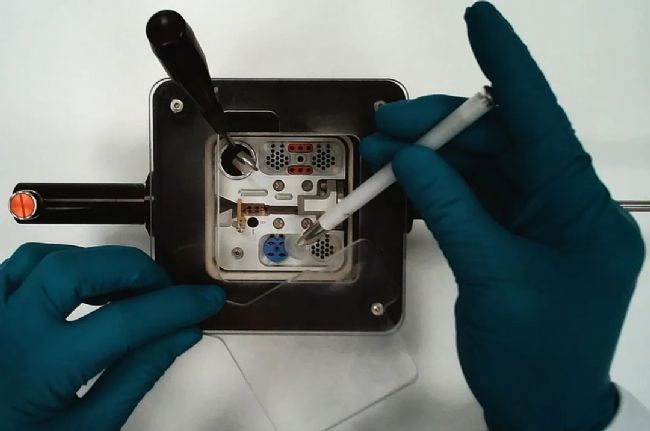 圖4:在冷凍顯微鏡套件轉移艙的GN2(氣態氮)環境中裝載網格。轉移艙的可見度在冷凍條件下不受干擾。
