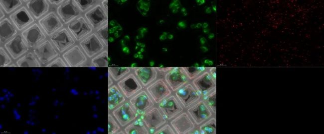 圖7:相機概覽圖像與共聚焦Z-堆棧相機和共聚焦圖像的組合含有XY坐標位置,因此可以匹配。所有圖像都包含在Coral Cryo軟件工作流程期間創建的相關項目文件夾中。HeLa細胞由德國海德堡歐洲分子生物學實驗室(EMBL)Mahamid Group的Ievgeniia Zagoriy友情提供。藍色 – Hoechst染料,細胞核;綠色 — 線粒體綠色熒光探針,線粒體;紅色 - 深紅色液滴和Bodipy熒光染料,脂滴。一個網格方格的邊長:90微米。完整網格直徑:3毫米。