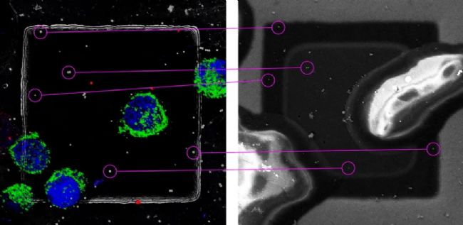 在網格條上選擇圍繞最終目標結構的幾處液滴,作為切片處理的坐標系。基本計算方法是考慮縮放、旋轉以及平移之后的線性仿射變換最后,在LM圖像中選擇目標結構并疊加到FIB圖像上。