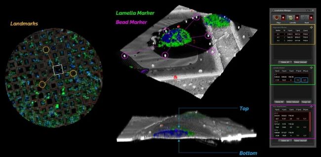 圖11:Coral Cryo軟件模塊標記點、薄片和液滴標記均可以在軟件工作流程中定義。反射圖像中細胞的頂部和底部坐標值可以作為在FIB SEM中正確計算靶區3D位置的額外參考。本文前述部分圖像中的相同細胞經過突出顯示,用于標記定義。
