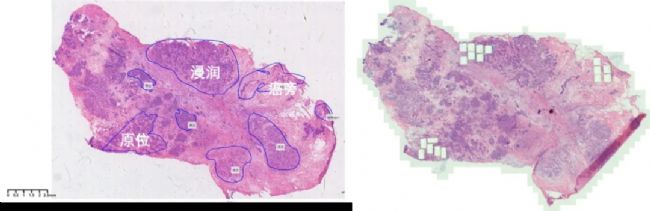 圖1. 組織切片樣本用于激光顯微切割分離體制備。經過蘇木精-伊紅(HE)染色確定組織切片中不同類型的細胞區域(左)包括原位癌、浸潤癌和癌旁細胞,在平行的未染色組織切片中的相應位置進行激光顯微切割獲得分離體(右)。