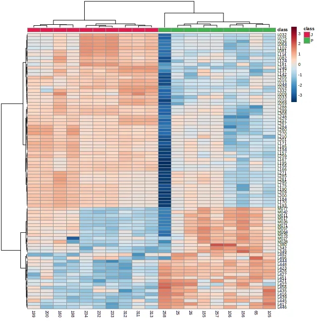 圖2. 浸潤癌組織v.s.癌旁組織中的差異代謝物熱圖。通過統計學分析,包括t-test的p值小于0.05以及PLSDA計算的VIP值不小于1作為篩選條件,獲得了84個差異代謝物。