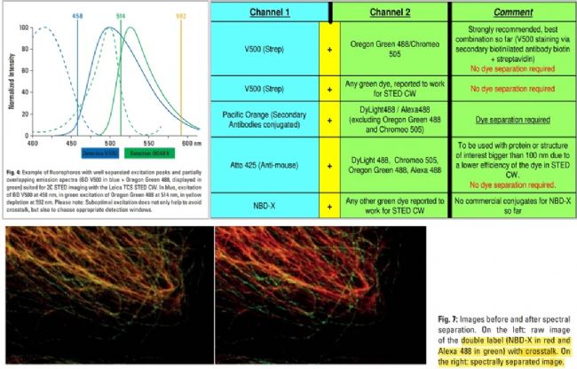 那時(shí)候大家試圖在百納米分辨率以內(nèi)研究細(xì)胞組分的相互作用的話,只能選擇類似BD Horizon V500和Alexa 488這種極易串色的染料組合,那時(shí)候的protocol里甚至還有串色拆分的教程。但是有和無(wú)的差別,已經(jīng)很震撼了,至少研究者們可以嘗試在百納米光學(xué)分辨率的空間里進(jìn)行分析研究了。