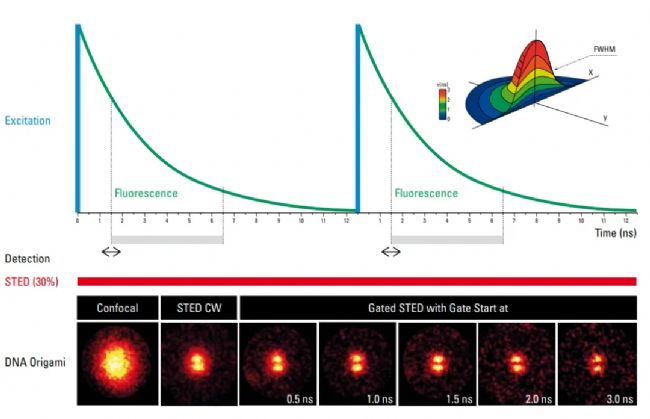首先讓人印象深刻的就是Gated CW-STED (gSTED)了,gSTED 使用更低的STED激光強(qiáng)度達(dá)到了比CW STED更好的分辨率,同時(shí)使用基于熒光壽命的時(shí)間門控技術(shù)用戶可以輕松地去掉592nm受激幅射光帶來(lái)的一些信號(hào)損失和模糊,這時(shí)候STED的分辨率提升到現(xiàn)在大家熟知的50nm。gSTED技術(shù)讓生物用戶可以使用非常熟悉的EGFP、AF488、mCherry等染料或熒光蛋白進(jìn)行STED成像。雖然很多常用成像探針無(wú)法將STED效果發(fā)揮到極致,但是對(duì)于生物學(xué)家而言,他們更偏向于不必?fù)Q實(shí)驗(yàn)體系就能實(shí)現(xiàn)研究目的。這是熒光壽命技術(shù)最初在STED商業(yè)化產(chǎn)品中的應(yīng)用,最近幾年這個(gè)領(lǐng)域又有很多進(jìn)展,一直持續(xù)不斷給使用者們帶來(lái)驚喜。