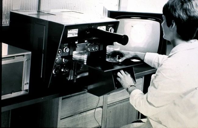 圖 1:QTM B,1963 年,第一套用于顯微鏡圖像的商用自動圖像分析系統,以電視攝像機為基礎,由英國劍橋的 Metals Research 公司開發。