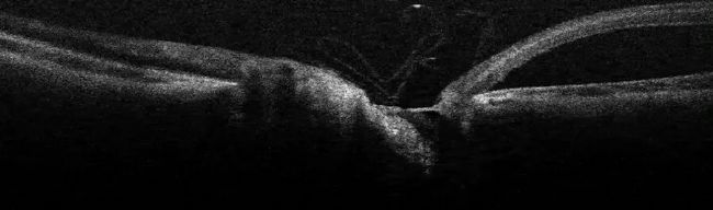 對患兒進行了全身麻醉,以便進行全面檢查。術中使用 OCT 觀察白色小葉,這在臨床上是無法做到的。成像顯示白色小葉位于視網膜下,與視網膜色素上皮粘連(圖 5)。這表明它不是視網膜腫瘤。它導致視網膜萎縮,一直延伸到內緣膜。